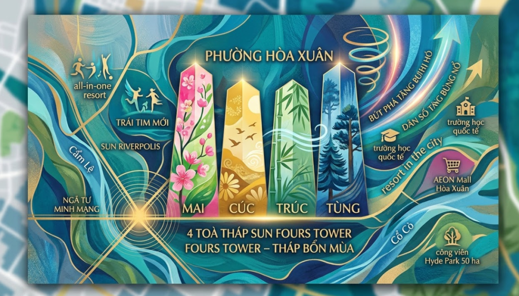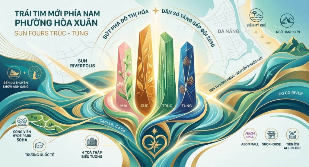 Phường Hòa Xuân – khu vực đang được ví như “trái tim mới” phía Nam Đà Nẵng – vừa chính thức chào đón một biểu tượng sống đẳng cấp: 4 tòa tháp Sun Fours Tower (hay còn gọi là FourS Tower – Tháp Bốn Mùa). Đây không chỉ là phân khu căn hộ cao tầng đầu tiên tại siêu dự án Sun Riverpolis 500 ha của Sun Group, mà còn là minh chứng sống động cho sự bứt phá đô thị hóa của toàn phường. Với vị trí đắc địa ngay ngã tư Minh Mạng – Nguyễn Phước Lan, bốn tòa tháp Mai – Cúc – Trúc – Tùng mang đến không gian sống nghỉ dưỡng giữa lòng đô thị hiện đại, kết hợp hoàn hảo giữa thiên nhiên sông nước và tiện ích all-in-one chuẩn resort.